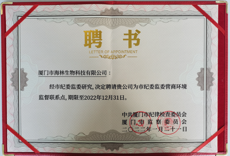 廈門市海林生物科技有限公司被聘為廈門市紀(jì)委監(jiān)委營商環(huán)境監(jiān)督聯(lián)系點(diǎn)